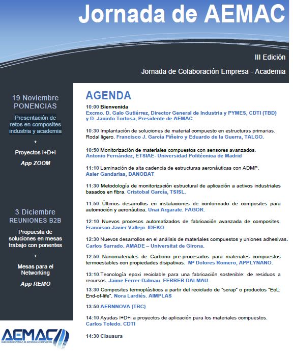 01/12/2020 SPARTA participates in the AEMAC Seminar "Challenges in composites" as a sponsor and with the presentation "Thermoplastic composites from scrap recycling or End-of-life products".