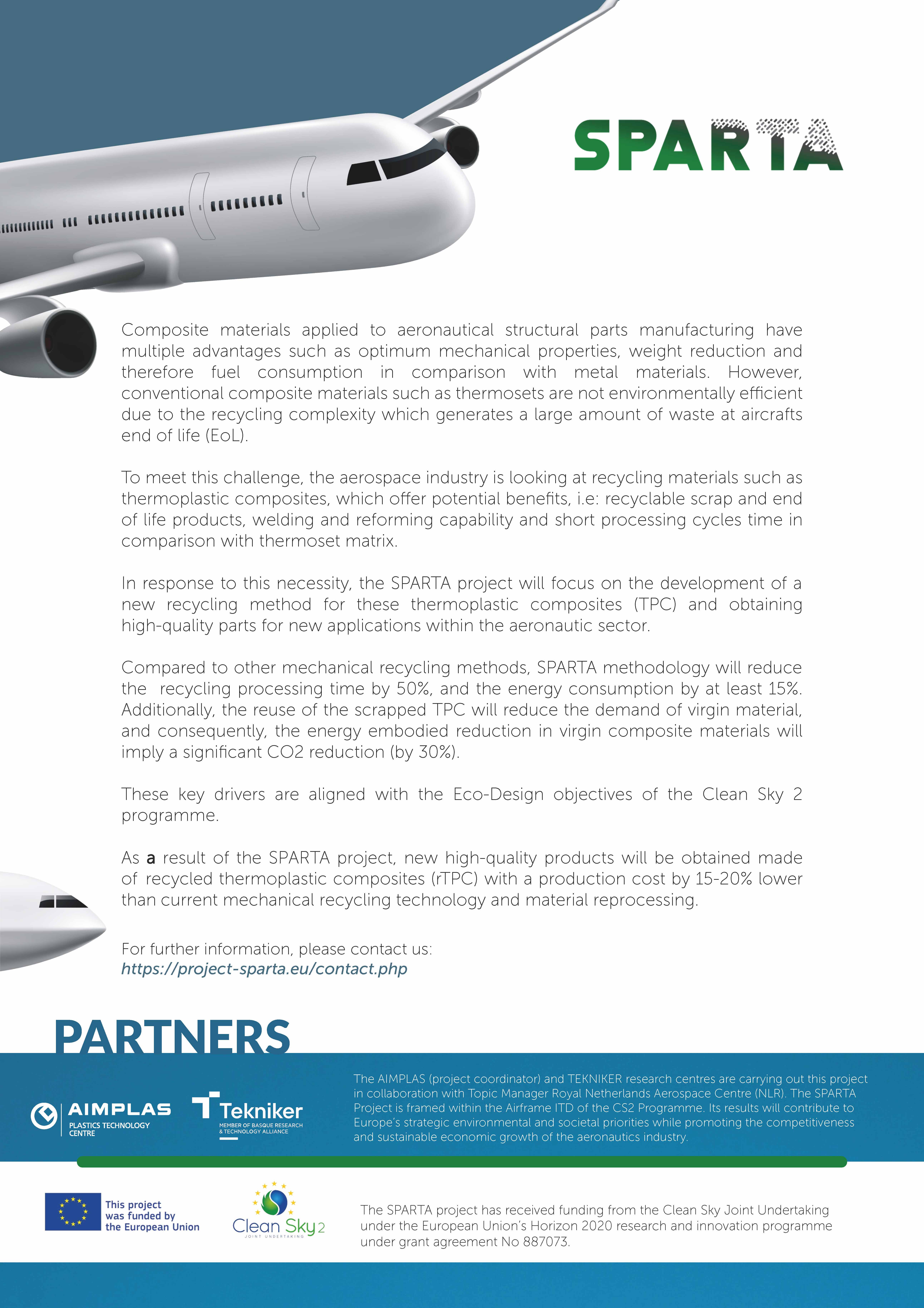 02/09/2020 The AIMPLAS (project coordinator) and TEKNIKER research centres are carrying out this project in collaboration with Topic Manager Royal Netherlands Aerospace Centre (NLR). The SPARTA Project is framed within the Airframe ITD of the CS2 Programme. Its results will contribute to Europe’s strategic environmental and societal priorities while promoting the competitiveness and sustainable economic growth of the aeronautics industry.